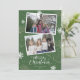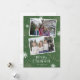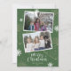 Custom green photo Merry Christmas cards featuring snowflakes and gifts on a green background with hand-lettered script font. Easily personalise these photo Christmas cards with your images and text.