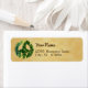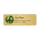 Custom return address labels with brown script and block letters and a leafy peace sign on a faux background