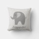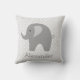 Custom grey elephant throw pillow for nursery room. Personalised kids and baby bedroom accessories. Cute baby shower gift idea for newborn boys or girls. Zoo animal cartoon design with grey and white polka dots background pattern. Customisable background colour ie neutral soft yellow, pastel pink, purple or light blue. Adorable gift idea for new mum / mother to be. Fun typography for childs name. Gender neutral decoration cushion. Jungle / safari theme home decor.
