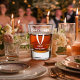 An old-fashioned whiskey glass with a classic shape. The glass is printed with the name or initials of the groom, along with a wedding date. A personalised gift for celebrating and toasting on the batch party or wedding day.