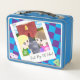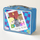 A lunch box with a checked pattern and customisable text, and school year featuring hand drawn art of Samantha and Stacey going to school and a small Beary and Ellie on the sides. All characters from the books of "The Underground Toy Society". The perfect lunch box to add to your child's back to school products!