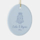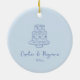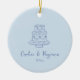 This wedding favor ornament has a sweet little line-drawn wedding cake illustration in soft blue at the top, with the couple's names in flowing script and their wedding date just below - simple, romantic, and really pretty on a reception table.