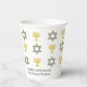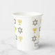 Elegant HAPPY HANUKKAH paper cup, showing faux gold and silver STAR OF DAVID and MENORAH in a tiled pattern. Text reads HAPPY HANUKKAH with a placeholder name, and is CUSTOMIZABLE, so you can PERSONALIZE it by adding your name or other text. Ideal for Hanukkah celebrations, and with customisation can be suitable for any Jewish-themed event. Choose from a wide selection of Hanukkah party supplies by Berean Designs.