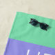 Happy bright coloured beach towel with lime, jade and mint green, teal turquoise, violet purple and light blue yellow stripes pattern, and fun HERE COMES THE SUN quote text. Celebrate summer time... beach time, pool time, fun time!