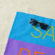 Happy bright coloured beach towel with lime green, hot pink, vibrant orange, azure turquoise, purple and dark blue stripes pattern, with a cute seahorse silhouette and fun SAND BEACH SURF OCEAN quote text. Celebrate summer time... beach time, pool time, fun time!