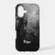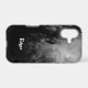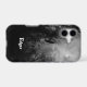 A custom iPhone case with white grunge type letters and a spooky Halloween sky with misty, dark trees along a spooky road, gothic ravens and a cloudy full moon in black and white.