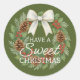 This beautifully designed holiday gift favor tag features the text "Have a Sweet Christmas" and showcases elegant watercolor artwork of a wreath embellished with a white bow, pinecones, green holly leaves, red berries, and pine needles. Its classy yet rustic design captures the essence of the December holiday season and appeals to those who appreciate artistic illustrations. The label offers customization options, allowing you to personalize it with your seasonal greeting, making it a thoughtful choice for spreading holiday cheer. These stickers will give your baking projects a unique and professional look!