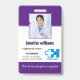 Create your own personalised employee name tags and badges using a vertical elegant modern template that is easy to add your own photo, company logo, Bar Code and other important information. A simple business design in purple and white & name and title with bar code. No minimum order.