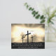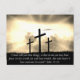 Decorate your space with uplifting words with this custom text Easter postcard. This design has the Bible verse John 16:33 in white script on a black background. The design shows three crucifixion crosses on a hill at sunset. The partially cloudy sky is brightened by sun rays and light coming out of the heavens. The verse reads "I have told you these things, so that in me you may have peace. In this world you will have trouble. But take heart! I have overcome the world." This postcard is fully customisable. Just hit the Personalise button to edit or delete the text, or the Customise button to change the reverse side colour, font colour, or font if you wish. Makes a great inspirational note or decoration. Great for lovers of God, Jesus, Christian faith, spirituality, Easter, Resurrection, and hope giving and inspirational verses from the Bible.