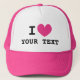 Custom I HEART trucker hat with pink love icon. Make your own personalised cap with this blank template. Custom colour heart with black typography.