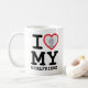 Create your own black and red I Love My Girlfriend custom Photo and Text mug with this modern and funny shirt template featuring a cool slab serif font and girlfriend photo into a huge red heart. Add your own photo, your name or any personalised text. The "I love My Girlfriend" mugs design is inspired by the classical "I love NY" logo t-shirt graphic design made by Milton Glaser, and I used Courier New Slab font instead of the original rounded slab serif typeface American Typewriter used by Glazer. Make your own unique gift for your boyfriend with this I love my girlfriend mugs!