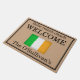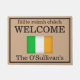 This custom door mat or outdoor rug features an image of the flag of Ireland in the center over a beige colored background. The phrase at the top of the rug says, "fáilte roimh chách" which is Irish for "welcome" and is printed just above the Irish flag. The flag is a the bold and beautiful green, white, and orange. A sample family name is printed near the bottom. You can personalize this doormat and add your own family name, business name, or custom message or quote. The mat is framed with a black printed border.