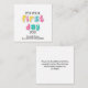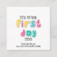 Custom IT'S YOUR FIRST DAY TOO Teacher to Parent Enclosure Cards, designed for schools or teachers to use when giving gifts to parents who are adjusting to their tiny humans going to pre-school or kindergarten for the first time. This would be a very kind gesture to give with a small favour gift, especially for providing additional pieces of information. Design shows fun colourful kiddies bubble alphabet typography and there is CUSTOMIZABLE TEXT where you can add your teacher or school name and further details on the back. Matching gifts available.