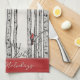 This modern kitchen towel features hand-drawn birch trees with red Cardinal birds perched on branches in black ink, with shading done in cross-hatch style, against an elegant ivory background. Personalise with you favourite Holiday greeting, a name, or a Family name.