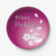 A set of purple birthday paper plates with an illustration of two Japanese snow rabbits, two sakura flowers, and four sakura flower petals on the lower right corner, and the customisable words "Happy Birthday!" on the left.