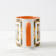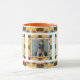 Custom Jolly Autumn Fall Winter Christmas Pattern Photo Picture Tea Coffee Mug. In traditional autumnal colors of bright orange, green, and gray; in a merry multicolour, maximalist geometric pattern. For winter warmer drinks and cheerful hot chocolate on cozy winter nights in. Change the three photos to your own pictures to celebrate family memories. Buy as a budget friendly festive keepsake tableware gift for her or grandparents.