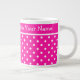 A chic white Jumbo-sized Mug to personalise, with a pattern of square Polka Dots in candy pink and white. Part of the Posh & Painterly 'Candy Floss' range.
