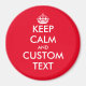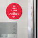 Custom Keep calm and carry on large round fridge magnet. Create your own funny parody. Modern typography template with big crown. All customisable colours. Red and white example. Personalised Birthday gift ideas for friends, family, coworker, employee, guests, clients, customers etc.