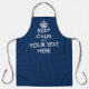 Custom keep calm and carry on large navy blue kitchen Apron for men and women. Modern typography template with crown silhouette. Personalised cooking aprons in any colour. Trendy template with fun typography design. Add your own name or humourous quote. Create your own unique Birthday party gift for mum, grill master, dad, sister, brother, father, mother, wife, husband, friend, grandma, grandpa, kids, boss, co worker, BBQ chef, cook, colleague, wedding couple etc. Available in small, medium and big size. Also great for dinner party, baking, dish washing, art & crafts work etc. Make a his and hers for him and her. Humour presents for friends and family.