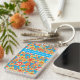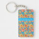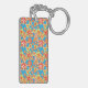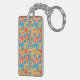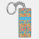 Never lose your keys again! Add your phone number or name to this pretty square acrylic Keychain, with a pattern of ditzy orange, red and yellow flowers on a turquoise blue background; from a handpainted paper collage by Judy Adamson.