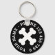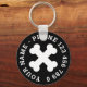 Custom keychain with crossbones, name and number. Personalised round ring key chain with name and phone number. Double sided print. Add your address too optionally. Background colour can be changed. Black and white example. Cool bone design with bold font. Also useful for pets.