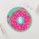 Custom kid's round pink doughnut Birthday party invitations. Cute sweet food theme party invites for children's Birthday, baby shower, sweet 16, event, reunion, dinner party, gathering, housewarming, etc. Personalised text template with custom background colour. Fun sprinkled doughnut design with turquoise blue background colour and whimsical typography. Personalise for boy or girl. Funny circle cut out shape design with colourful food illustration. Make circular invites for 4th 5th 6th 7th 8 th 9th 10th 11th 12th 13th B'day etc. Custom invite cards for son, daughter, grandchild, newborn etc. Also fun for adults. Double sided print.