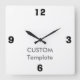 Custom LARGE 10.75" SQUARE Wall Clock, Grade-A acrylic Blank Template. AD LIB Font - Main Quarter Hours Templated Only (12, 3, 6 & 9). All hours option also available in the Shop plus dozens of font options. CUSTOMIZE: Simply select "Customise" then delete "CUSTOM Template" & begin to personalise your clock. IF YOU WISH TO CHANGE THE SIZE OR COLOR OF THE NUMBERS: Simply "select all" in Edit Options, then click on the Font Size or Colour drop down menus to change them. Design your own personalised, customisable wall clock. All font and style options available as templates. Great for a birthday, Christmas, Father's Day, Mother's Day or other celebration gifts for him, her, a teenager, a boss, work colleague, a friend, or for your home or office.