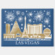 This design shows the Las Vegas Strip skyline with brilliant fireworks above the cityscape, featuring famous iconic landmarks including the Luxor Pyramid, Paris Las Vegas Eiffel Tower, and Mandalay Bay. Illustrated in a clean bold minimalist line art style with a mid‑century modern illustration and retro vintage style influence, it uses a navy, gold, and white art palette that highlights both architecture and celebration.