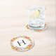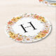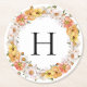 This custom round coaster features a delicate floral wreath, with soft shades of orange, yellow, and white flowers surrounding a monogrammed initial in the centre. The letter "H" is displayed in a classic serif font, providing an elegant contrast to the natural, watercolor-style flowers. The neutral colour palette of the flowers makes this coaster versatile, perfect for various home décor styles, from rustic and vintage to modern. Ideal for personalising your wedding, home, or event, this custom initial design offers both a decorative and functional touch to any setting.