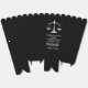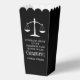 This custom black law school graduation party popcorn favour box features the college graduate name in white typography for the class of 2026. Customise with your university under the scales of justice for a great graduation keepsake for a new lawyer or attorney.
