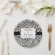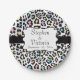 Chic, modern, pretty wild animal big cats leopard print paper plates in black and white with splashes of melon, yellow, pink, blue, green, and lavender with a black stripe and white edged with black banner that you can personalise with the wedding couple's names and wedding date!
