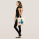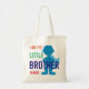Custom little brother superhero silhouette boys tote bag. Orange, green, blue and red lettering spells out "I am the little brother" with a name underneath. Personalise this tote bag for a gift for a little brother. Blue superhero boy silhouette with cape, boots, and hands on hips. Fun gift for a little brother. Coordinate with a big brother design. www.SamAnnDesigns.com