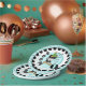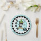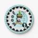 Little Dog Lover 1st Birthday paper plates, great for kids turning one year old who love puppies and dogs! Features a cute black and white dog in a green and yellow polka dotted party hat, big dog bone, text that reds WOOF The Little Dog Lover is 1, and has a decorative black ring and border edge of aqua, light blue, and white chevron stripes! You can easily add the birthday child's name to these 1st puppy dog paper plates a well as a thank you message to the guests! We have the matching T-shirts, bibs, bags, and more!