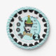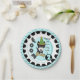 Little Dog Lover 2nd Birthday paper plates, great for kids turning two years old who love puppies and dogs! Features a cute black and white dog in a green and yellow polka dotted party hat, big dog bone, text that reds WOOF The Little Dog Lover is 2, and has a decorative black ring and border edge of aqua, light blue, and white chevron stripes! You can easily add the birthday child's name to these 2nd puppy dog paper plates a well as a thank you message to the guests! We have the matching T-shirts, bibs, bags, and more!