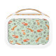 This customized lunchbox is as cute as its pictures, and the frame itself is more colorful and attractive than pictures. It has not yet been used so can't review durability. The production was super-fast, but shipping did take much longer than expected. Custom product shipped two days after order, but package took ten days after that to arrive. In the same period I received several other orders shipped standard from other services in two or three days. cute font, goes with overall style, but tiny print. My child did not notice her name was on the box until I pointed it out.