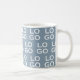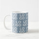 This custom coffee mug features a light dusty blue colored background with a sample company of business logo tiled across each side. You can personalize the mug to add your own custom company or business logo. It's perfect for customer or client gifts, employees, corporate events, and Christmas parties.
