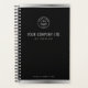 This custom planner cover boasts a sophisticated design with a sleek black background, elegantly framed by polished silver borders. Your personalised logo and company information are prominently displayed in a modern silver tone at the top, while your website address is subtly featured within a silver band at the bottom. This refined aesthetic offers a professional and minimalist look, perfect for a chic brand statement.