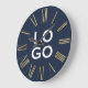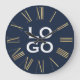 This simple yet sophisticated custom wall clock features a dark navy blue colored background with a sample company of business logo placed in the center. You can personalize the clock to add your own company or business logo, or other custom image. The hours are printed in a gold foil design, Roman numeral pattern.