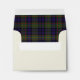 Lovely custom note card envelope done in cream, with the colourful purple, green, yellow, black, and red clan MacLellan tartan pattern, on the inside of the envelope. Black script text return address, on the back flap, is ready to personalise. Perfect finishing touch to our MacLellan plaid Thank You note card.