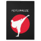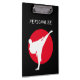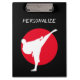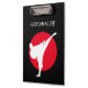 Custom martial arts karate school instructor clipboard. Add your own name, team, school, club etc. Nice gift idea for teacher, coach etc. Kick logo with text template. Black or custom colour background. Double sided print with red rising sun logo. Also great for other fight sports like ju jitsu, taekwondo, judo, aikido, kickboxing, jiu jitsu, muay thai etc. Custom materials and accessories for class.