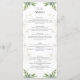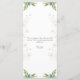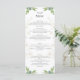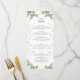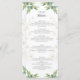 This elegant wedding menu features delicate greenery and white floral accents framing the text. The design is both sophisticated and natural, perfect for a semi-formal celebration. The floral artwork surrounding the menu gives a fresh, organic feel. Fully customisable text allows for clear, tailored information about the dining experience and ingredients. The back provides a heartfelt message of gratitude, leaving space for personal touches or more menu details.