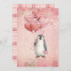 Happy Valentine's Day romantic card with a personalized message and a penguin illustration with heart balloons. Pink and red background with a plaid backing.