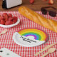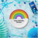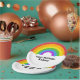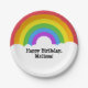 These paper party plates are ready to be personalised with your own custom message. They features a retro style illustration of a brightly coloured rainbow with white clouds below. Your message appears in bold black lettering against the white clouds.