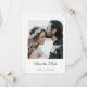 This simply chic photo wedding save the date flat card template features a striking minimalist, modern design. Please browse our shop for a version of this design with Save the Date text in gold, and also in a postcard format! The front features your first names under your favourite photo and a 'save the date' message conveyed in an elegant looping cursive handwriting script. Its flourish and flow is accentuated by the 'less is more' aesthetic of this design. This save the date design element is included on both sides and can't be altered, though you might choose to delete it on the back for an even simpler look. And on the back you can of course in addition to replacing our sample info with your own, delete text fields that you don't need, or change the wording, as well as change font, size and colour. You might for example change 'ARE GETTING MARRIED' to 'ARE TYING THE KNOT', or something else, or you might delete the sample website info without replacing it with your own website info, or you might replace it with a different message entirely. When you edit for your own first names on the back, you might also choose to include your last names. The default colour for your names on the front is black and the default colours for the text on the back are black and a slightly softened black. The default background colour on both sides is set as transparent, to let the paper colour simply serve as the base tone. But you can edit this and change the look of one or both sides in this regard as well to suit your style. Customise this elegant modern minimalist wedding save the date flat card template with your photo and your inspiration and make it uniquely yours!