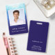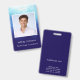 Easily customize this unique modern employee ID badge with a name, profession and photo. This dark blue name tag with clear simple white script can be edited for your purposes. Add your name and title and photo on the front, on the back is a place for more custom text. You could add an ID number, or company address, telephone number, email or website address. I created this unique design with white and blue nebula fog. It looks cool on the dark blue background. This would be a great employee photo ID badge for science and technology field specialists, IT, Web designer, aerospace, or the gaming store.