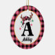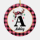 Celebrate Christmas with this personalised family ornament featuring a plaid Santa hat, antlers, and festive ornaments! The bold monogram initial and customisable name make it perfect for holiday gatherings and family photos.