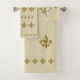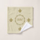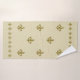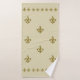 Pale yellow or off-white bath towels with gold colour fleur de lis pattern. The wash cloth has a personalised monogram. To add your custom initials, click on the "personalise this template" button. There is a matching shower curtain & bath mat. Classic look decor.