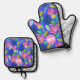Custom monogram floral blue oven mitts. Blue colourful tropical Oven Mitt & Pot Holder Set with fruits, flowers, pineappels. Personalised kitchen accessorie for women, mothers, wifes, cookers, chiefs. Gift idea for birthdays, mothers day, christmas
