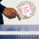 custom monogram geometric colorful square pattern ping pong paddle , elegant pink white and green yellow square pattern ping pong paddle.