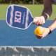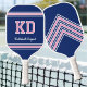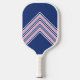 Stand out on court with a custom pickleball paddle! Personalise the template with your monogrammed initials and text — ideal for a player's name, team name, location, or a fun saying. This sports jersey style design features a retro block-style font, trendy script, and matching chevron colours on the reverse side. Perfect for all ages, including kids, teenagers, and adults. Custom paddles make a lovely unique gift for friends, family, and Pickleball enthusiasts! Colours: pink, navy dark blue and white.